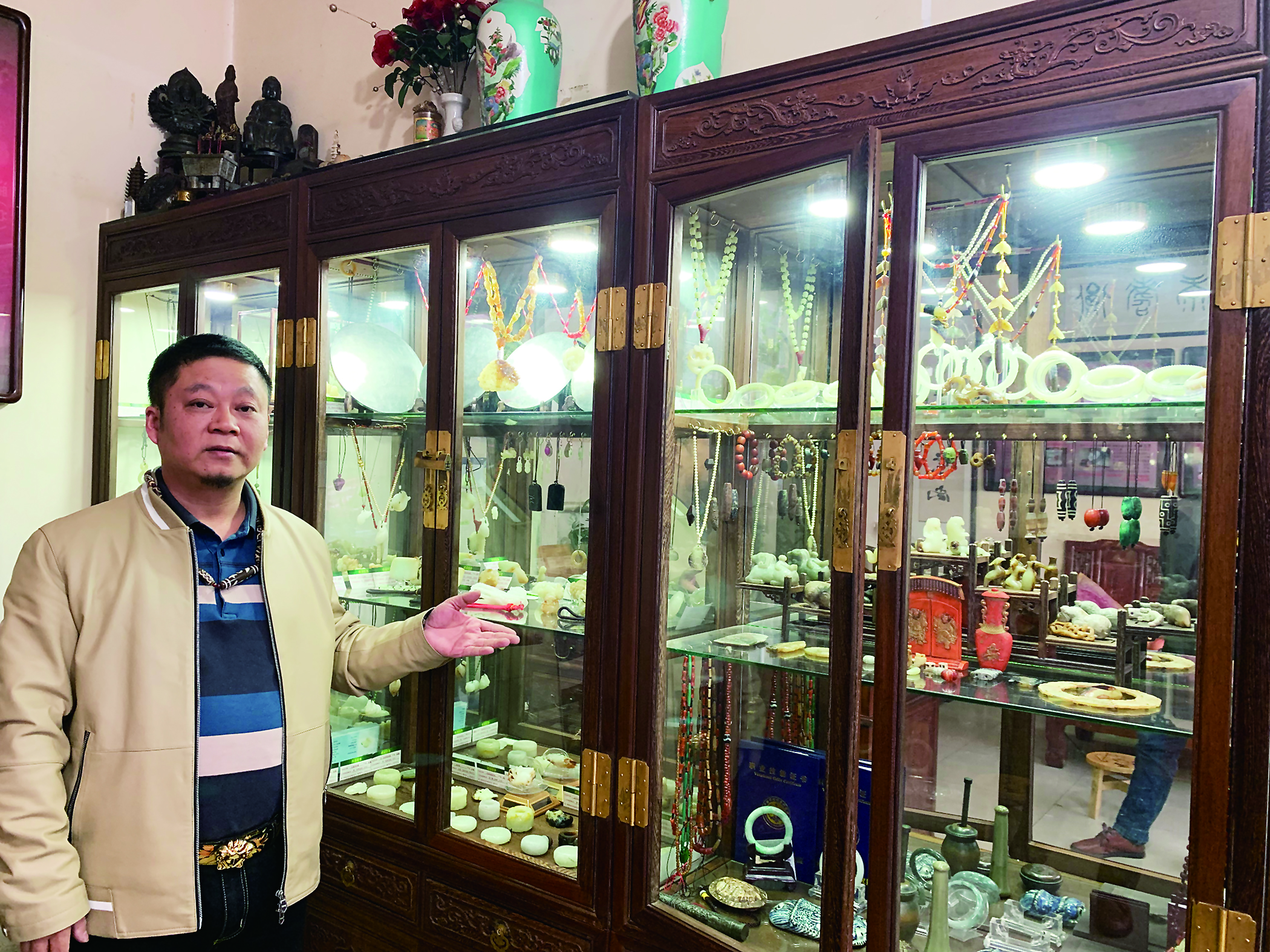 走进陈忍的收藏馆,柜子里面摆满了各类“宝贝”,包括玉器古玩、历代钱币、陶瓷器皿、家具杂件等传统品类,蔚为壮观。