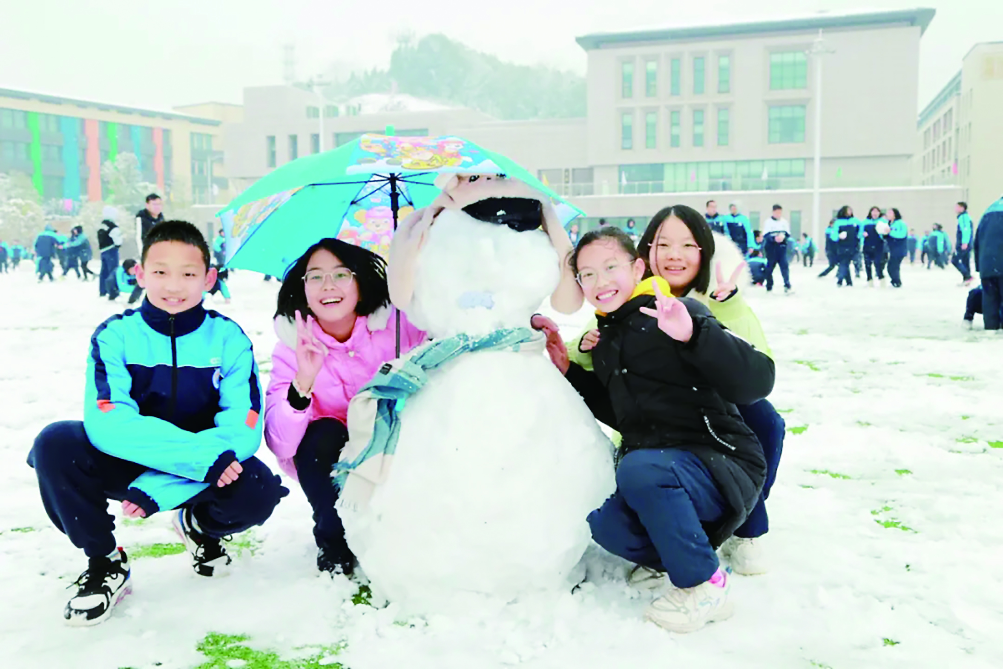 2021年冬季的第一场雪悄然而至,片片雪花为长郡云龙实验学校增添了银装素裹的独特魅力。孩子们在校园里堆雪人、打雪仗,教师们冒严寒清扫道路积雪,用心守护这一片岁月静好的冬日景象。图为孩子们围着堆好的雪人拍照留念。