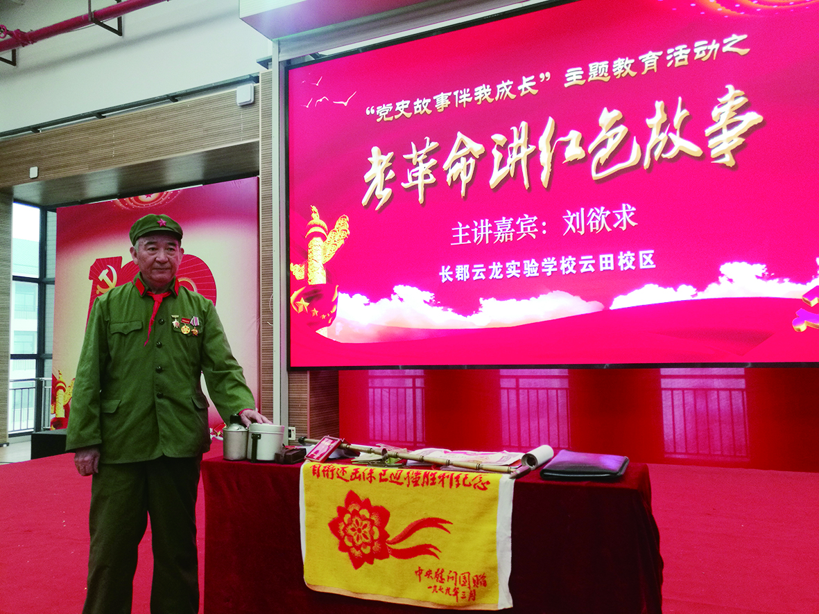 ▲刘欲求老人在长郡云龙实验学校云田校区宣讲红色故事。记者/李逸峰 摄