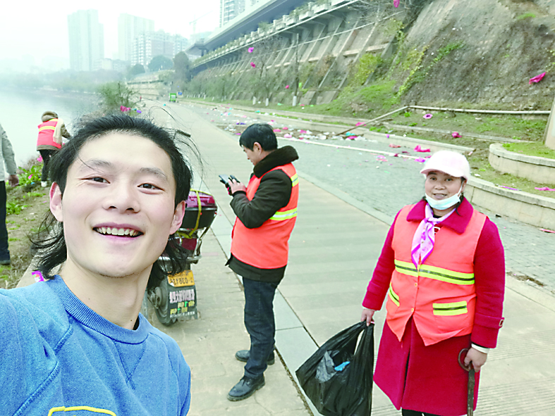▶贺明峰与环卫工捡垃圾时合影。 受访者供图