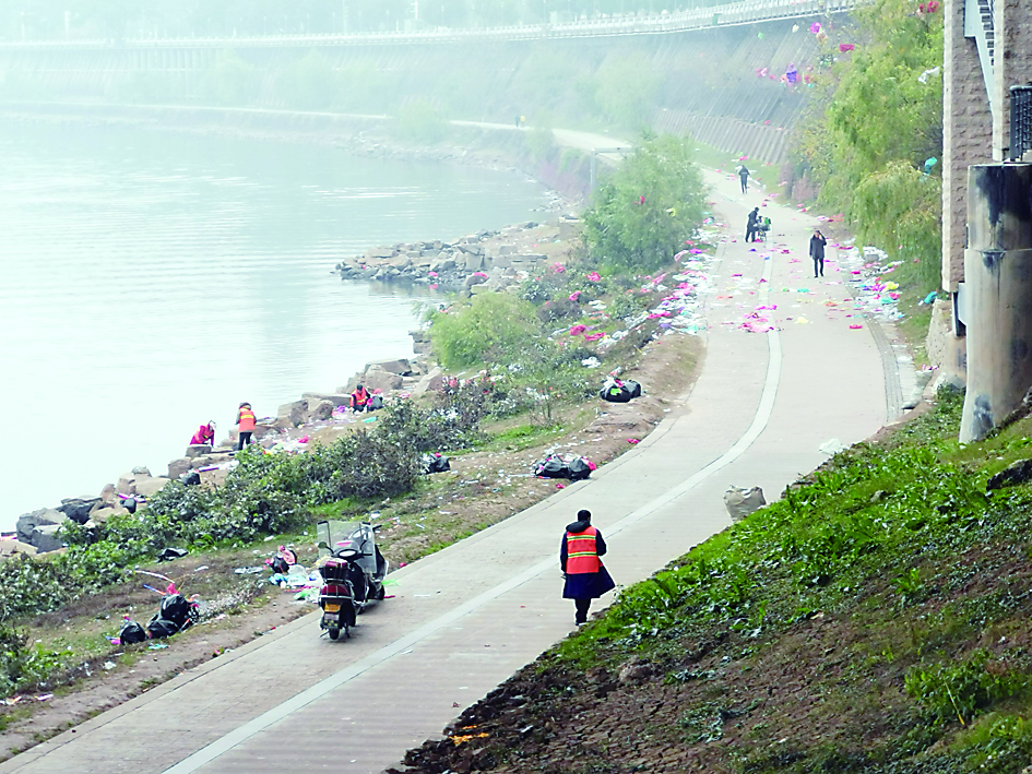 ▶风光带残留大量垃圾,环卫工正在捡拾。 受访者供图
