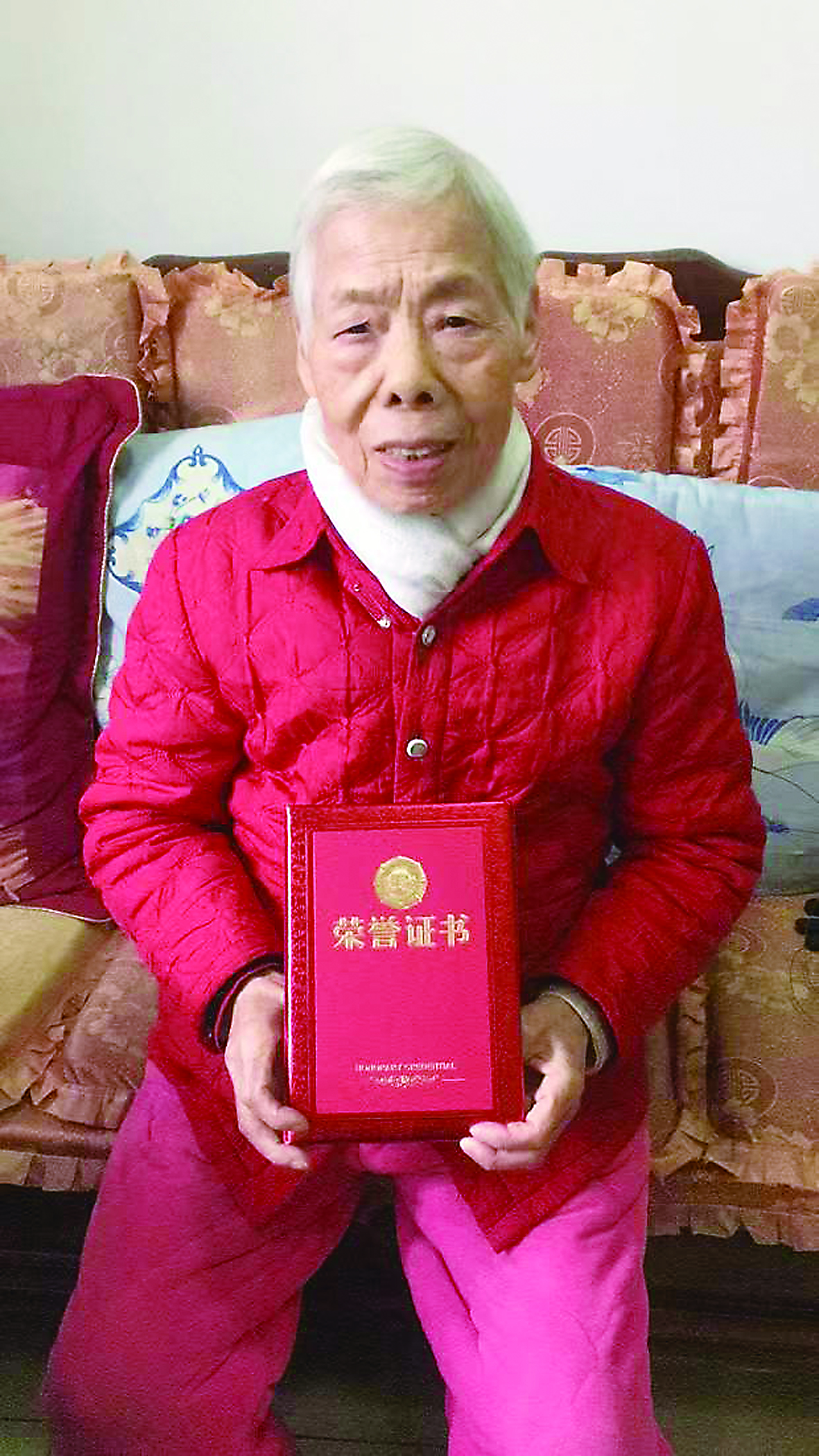 ▲手捧荣誉证书的刘运秀老人。姜女士供图