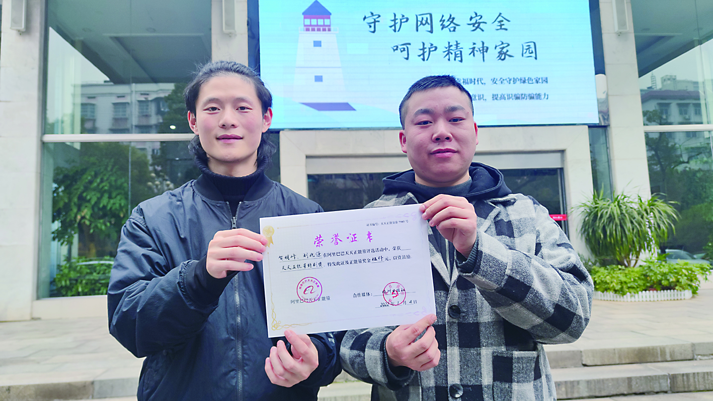 ▲跨年夜风光带留下大量垃圾,贺明峰、刘兆源看到视频后选择当“行动派”。昨日,本报联合阿里巴巴天天正能量授予他俩特别奖,并为两人颁发5000元正能量奖金。图为两人展示拿到的荣誉证书。 记者/杨凌凌 摄