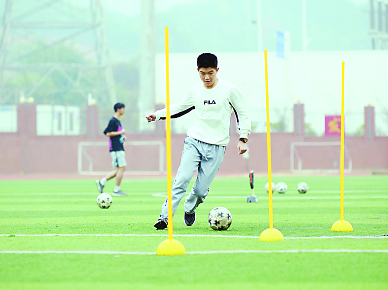 ▲市二中的同学参加足球运球绕杆射门测试(资料图)。 记者/戴凛 摄