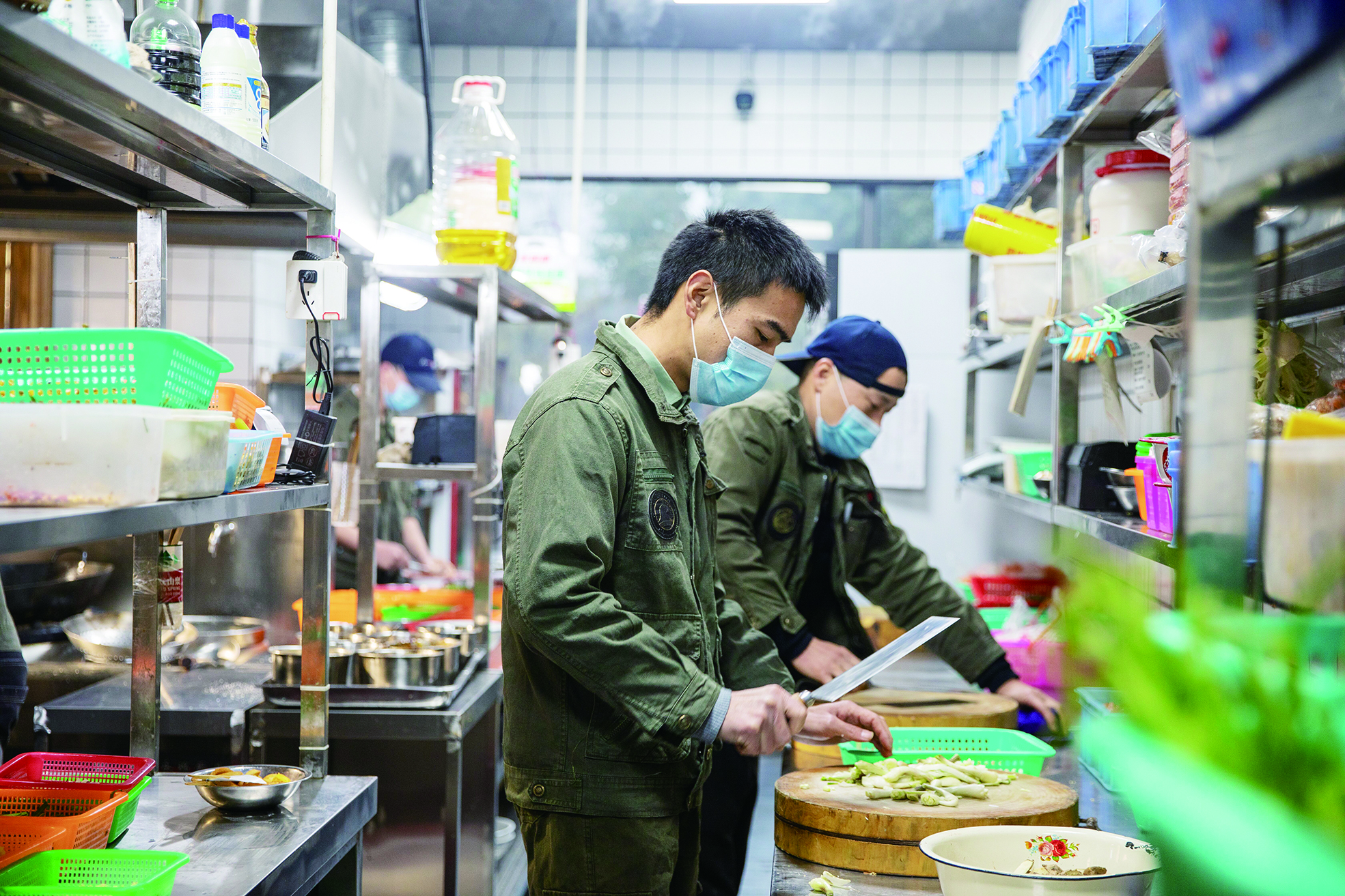 ▲后厨忙不赢的时候,李刚(前)也会来帮忙。记者/张媛 摄