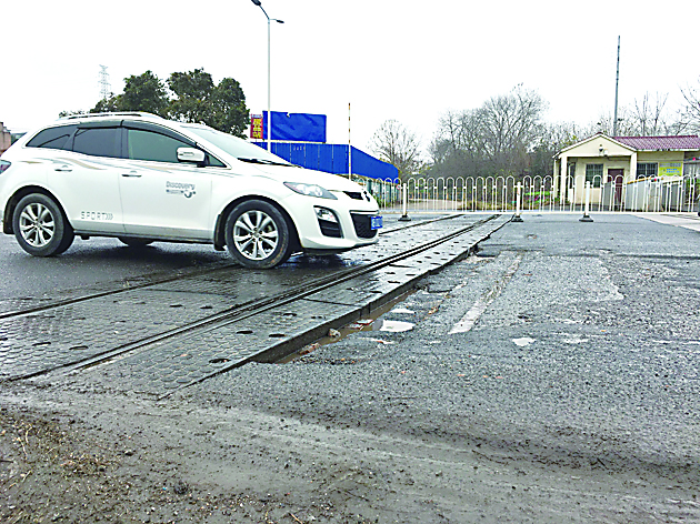 ▲铁路道口已停用,路面破损。 记者/刘平 摄