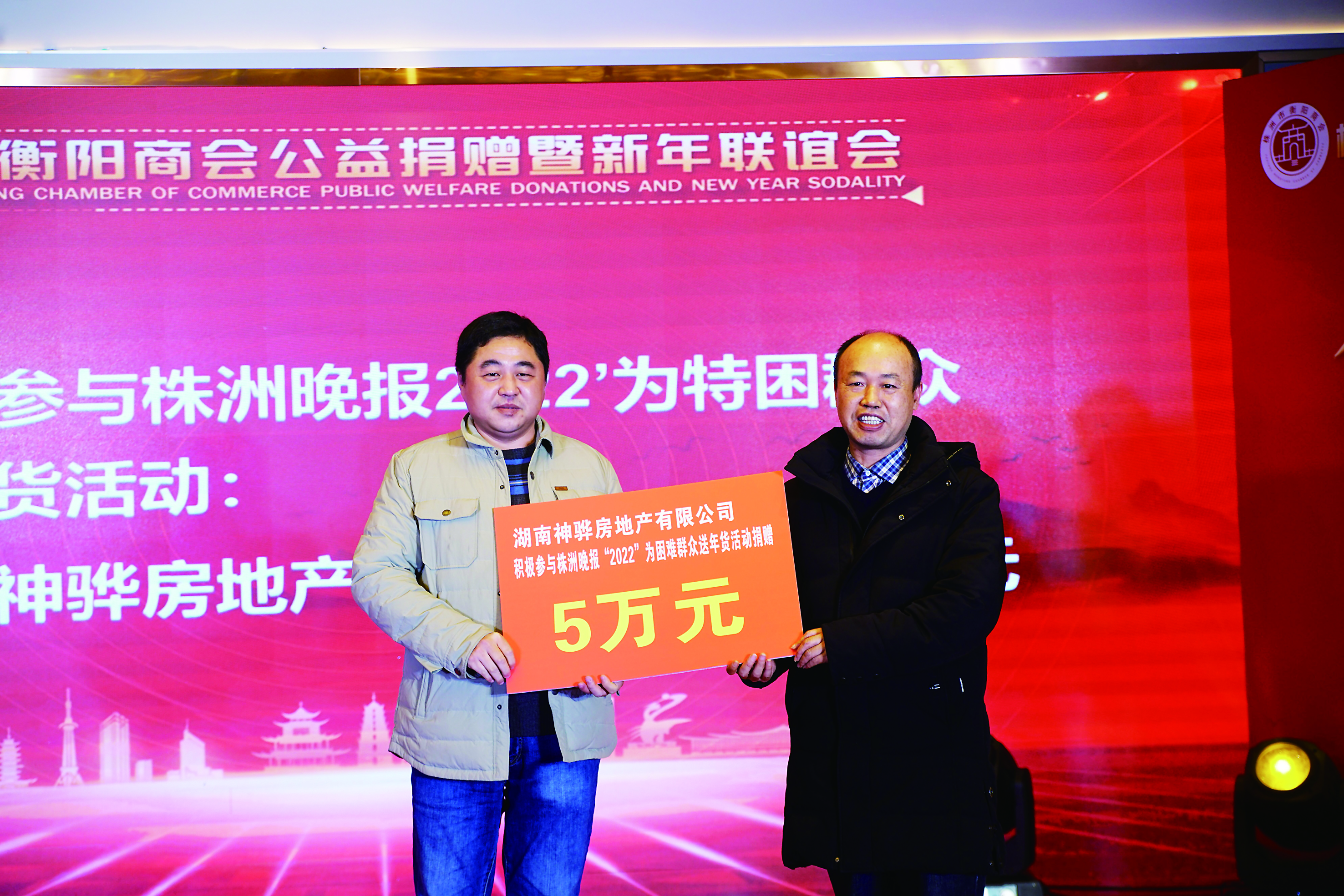 神骅地产成立于2009年,是湖南三神集团旗下企业。从成立之日起,公司就将公益作为一项重要事业来做。“企业发展壮大,离不开党和政府的政策。社会需要我们出力的时候,我们也会义不容辞。”在株洲市衡阳商会2022年公益捐赠仪式上,神骅地产董事长钟学军说出这番话,并向株洲晚报“送年货”活动捐出5万元。