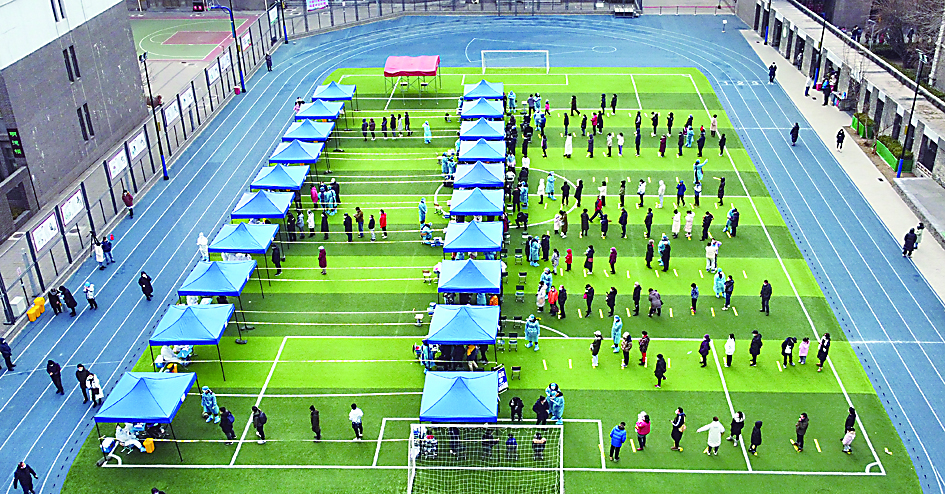 ▲1月9日拍摄的设在天津市南开区鼓楼街道中营小学操场的核酸检测点。 新华社记者 孙凡越 摄