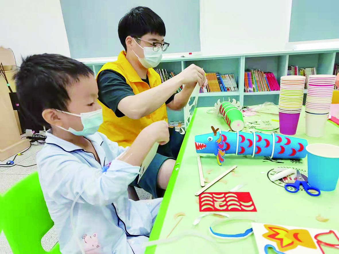 ▲住院期间程程和义工小哥哥进行手工艺。 (受访者供图)