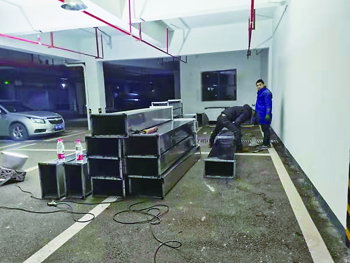 ▲地下车库里搭建的房屋已基本建成。记者/易楚曈 摄 ◀磐龙世纪城·玉兰谷小区地下车库,施工人员正在安装排烟管道。受访者供图