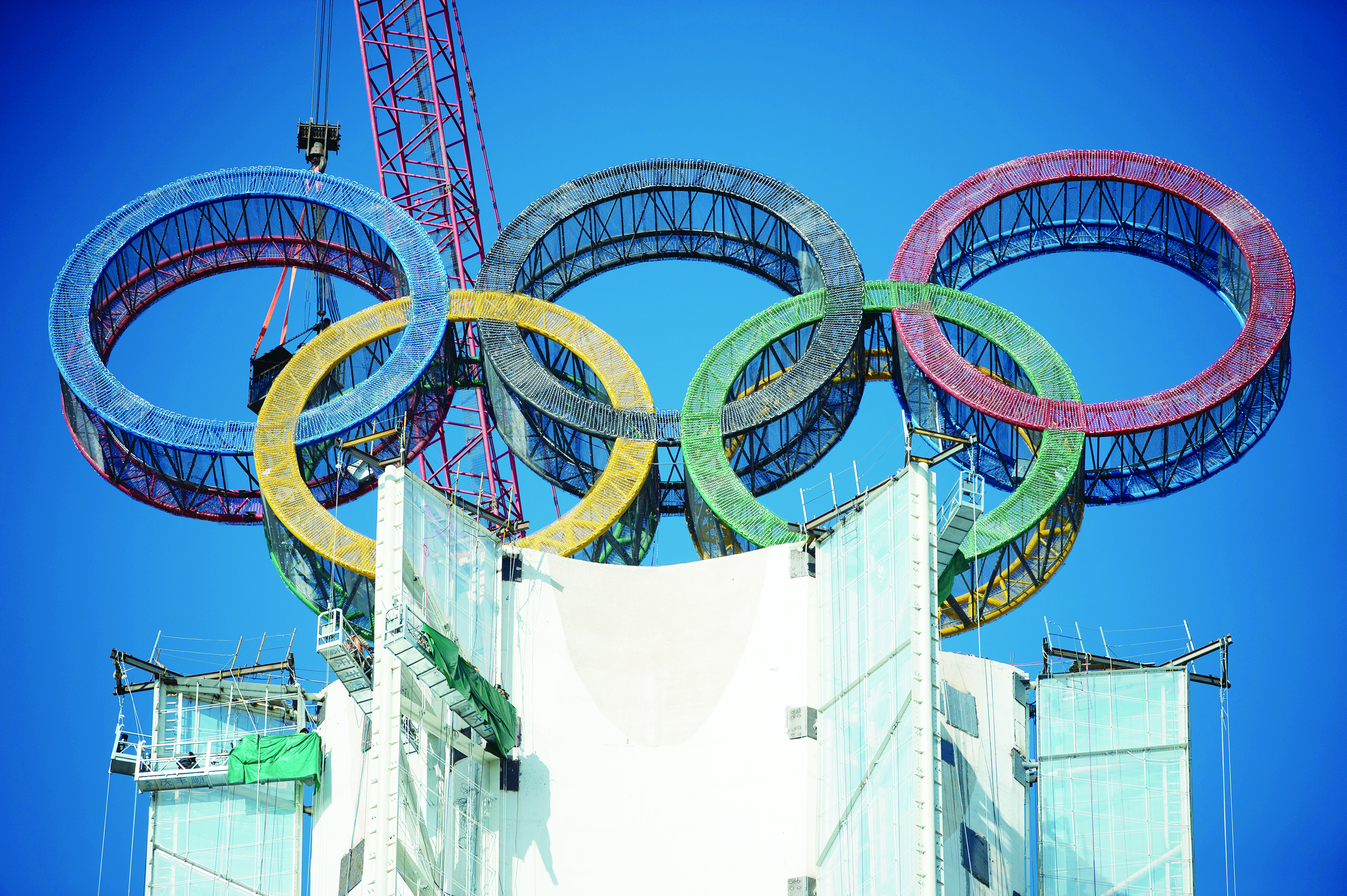 近日,位于北京冬奥会延庆赛区的“海陀塔”上的奥运五环结构吊装作业完成,进入工程收尾阶段。塔顶设置奥运五环标志,表面安装了共计7万余个白色点光源,塔身加装飘带形装饰。据介绍,“海陀塔”预计2022年1月底前完工,届时将在夜间点亮灯光景观,成为北京冬奥会标志性景观之一。图为1月11日拍摄的“海陀塔”塔顶的奥运五环标志。