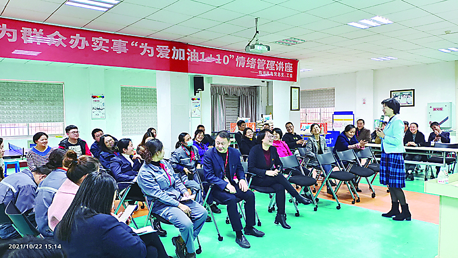 ▲2021年10月22日,市妇联“为爱加油1+10”项目受邀为株洲机电的全体职工开展情绪管理讲座。 通讯员供图