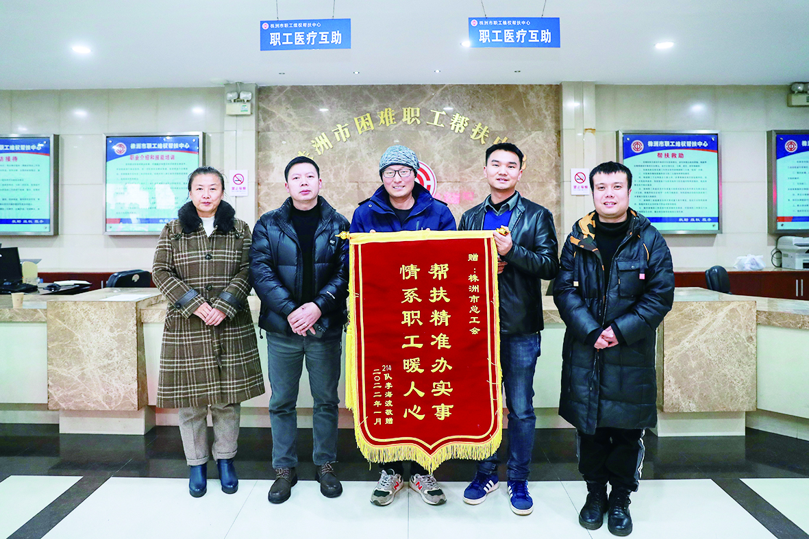 ▲90后职工李海波向株洲市困难职工帮扶中心送上锦旗。通讯员供图