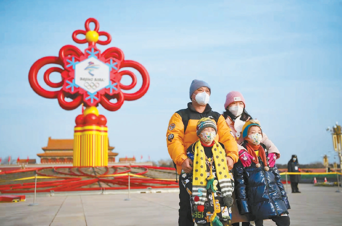 随着春节和冬奥会临近,镶嵌着北京2022年冬奥会会徽及冰雪元素的巨型中国结已矗立在北京天安门广场,该中国结为“精彩冬奥”主题花坛的主体部分。