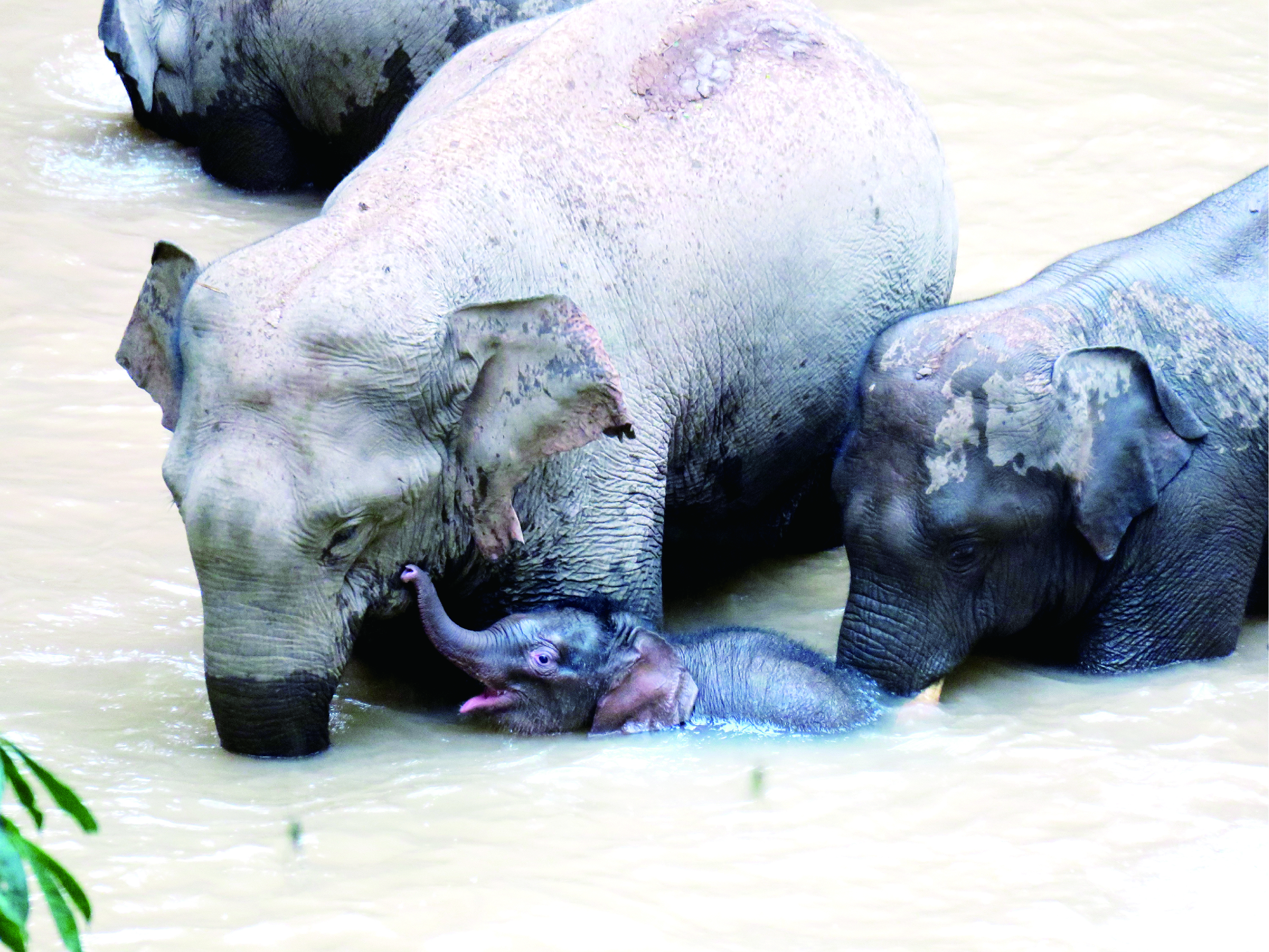 一头野象妈妈带着新出生象宝宝戏水的视频近期走红网络。有关人士介绍,这头小象在位于云南西双版纳的野象谷出生。最近,工作人员在野象谷陆续观察到4个象群的6头新生小象,这表明近期有野象宝宝“扎堆”出生,也意味着我国仅存约300头的野生亚洲象呈健康繁衍的态势。图为新生小象与“小缺耳家族”象群戏水(2021年11月25日摄)。