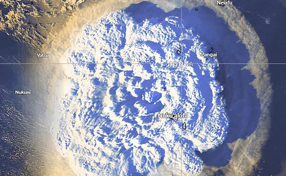 南太平洋岛国汤加的洪阿哈阿帕伊岛海底火山14、15日连续两天剧烈喷发,首都努库阿洛法出现1.2米高的海啸。卫星图像显示,喷发的大片火山灰以及气体像蘑菇云一样,从蓝色的太平洋海域升起。据悉,此次火山喷发规模非常巨大,释放的能量大概相当于1000颗广岛原子弹。此次过程未对中国沿岸造成灾害性影响。