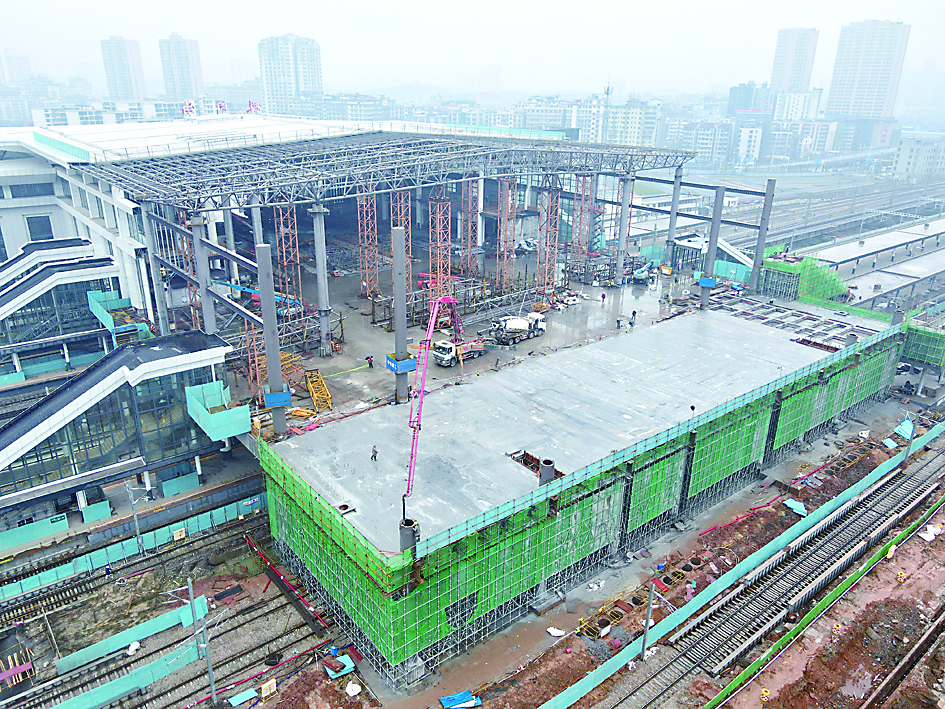 本报讯(株洲晚报融媒体记者/廖明 通讯员/邓智)1月17日,株洲火车站改扩建工程又传来好消息:当天14时10分许,伴随着最后一立方米混凝土的浇筑到位,株洲站改扩建工程J—H轴(二、三站台间)2200平方米高架候车厅楼板浇筑顺利完成,比预计工期提前5天,为春运期间不停工的钢结构施工争取了宝贵时间。