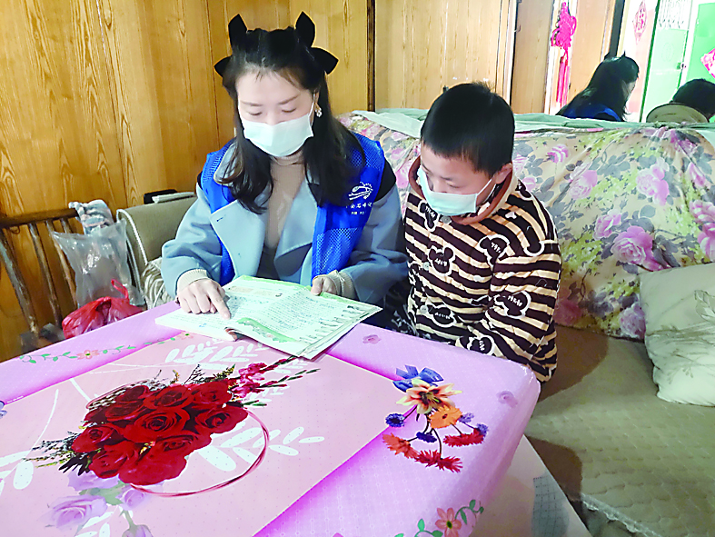 ▲响石岭社区网格员给洋洋辅导功课。记者/邱鹏 摄