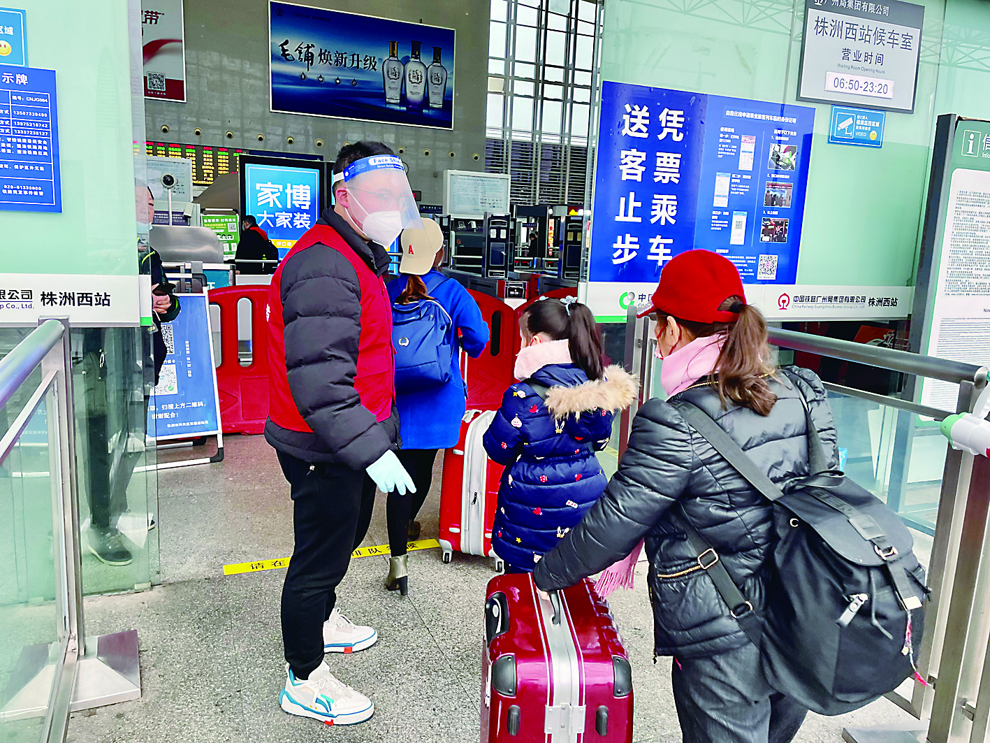 本报讯(株洲晚报融媒体记者/杨如 通讯员/张迅嘉)“请您出示健康码和行程码,谢谢!”1月17日,春运首日,株洲西站人来人往,志愿者在售票厅、检票口、候车厅等处,开展“情满旅途·暖冬行动”志愿活动。