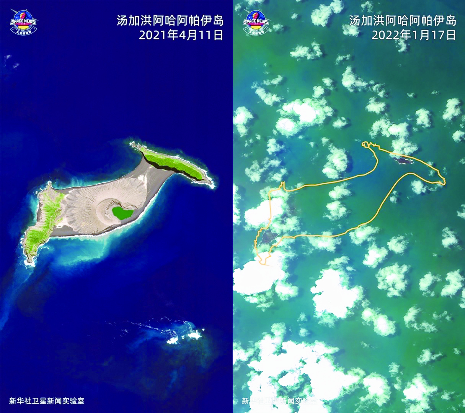 ▲这张拼版照片显示的是:2021年4月11日Worldview02卫星拍摄的汤加洪阿哈阿帕伊岛卫星图片(左)和2022年1月17日“高分一号”卫星拍摄的该岛火山喷发后的卫星图片,橘色曲线为按照地理坐标标注出的岛屿原先轮廓。 新华社发/新华社卫星新闻实验室 供图