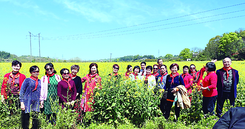 这张彩照拍摄于2021年3月,这一年,正是谭翠余和张百卉与同学们加入少先队的第60个年头。这群已近古稀的同学们再聚首,每次这样的聚会都有来自市外、省外、乃至国外的同学参与。他们特意戴上了鲜艳的红领巾,高声唱起了《少年》等歌曲。昔日同窗勤读,冉冉朝阳翩翩少年;今夕共聚喜庆,艳红夕阳辉映当年。谭翠余阿姨说:“入队60年再相聚,我们还是曾经那些‘少年’。”他们胸前的红领巾在金灿灿的油菜花衬托下,红得格外耀眼。