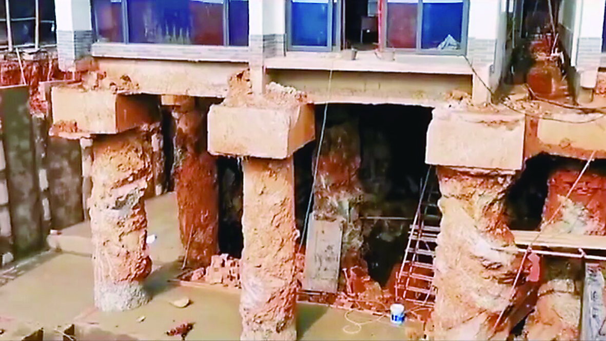 ◀建筑下方被挖空,成为“吊脚楼”。 视频截图