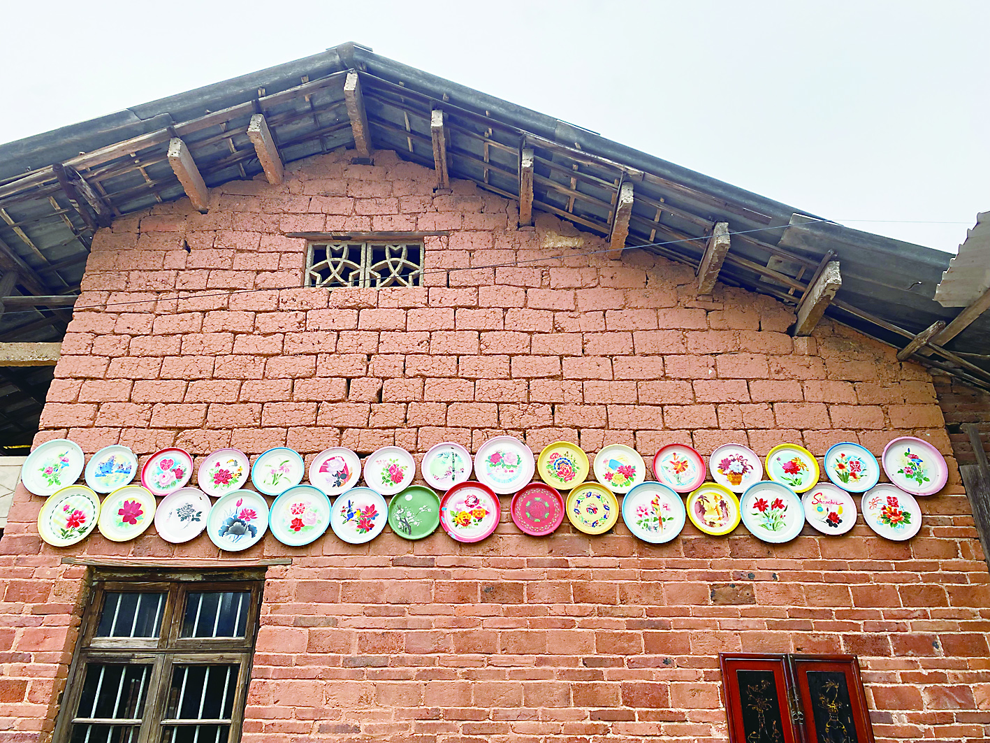 ▲屋外墙上挂着杨石林收藏的搪瓷盆。记者/旷昆红 摄