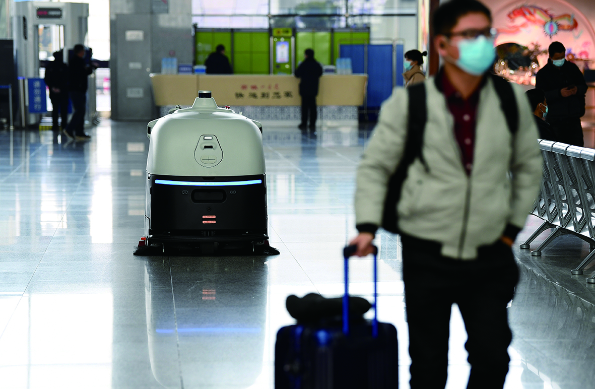 ◀1月18日,地面清扫消毒机器人“小德”在合肥南站进行地面清扫消毒。 新华社记者/刘军喜 摄