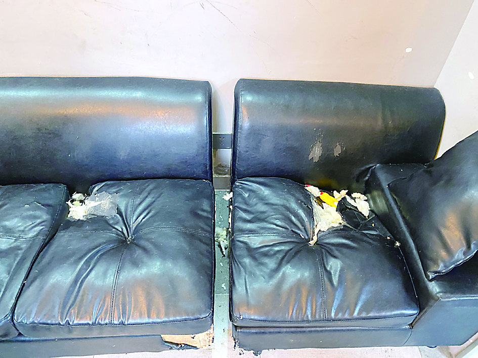 ▲真皮沙发多处破损,露出海绵。 记者/姚时美 摄