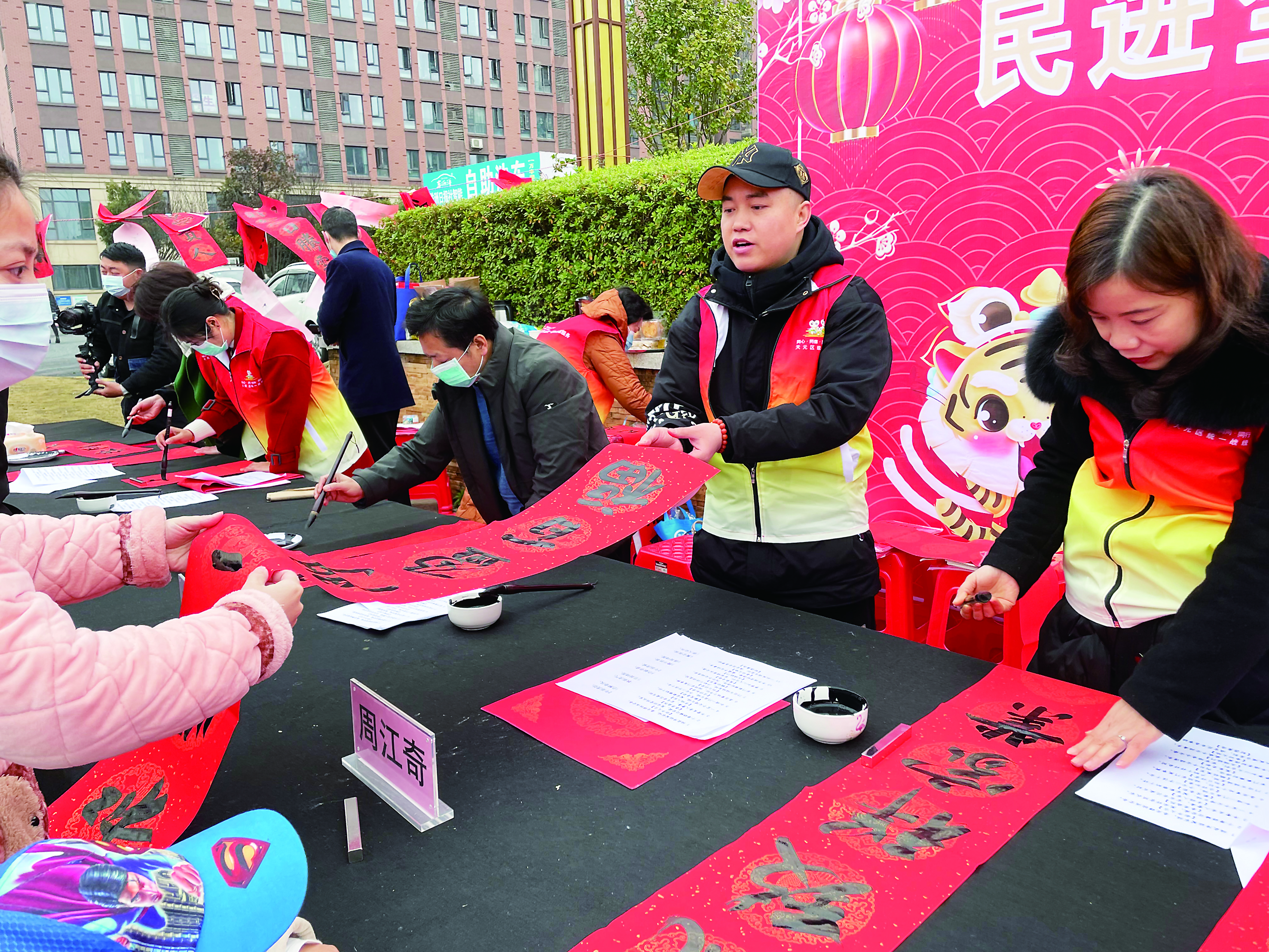 活动现场,8位书法家根据群众的喜爱“量身定制”书写春联,免费赠送给周边居民。虽然天气寒冷,大家热情不减,现场书写的1000余副寓意喜庆、吉祥的对联,深受群众喜爱。