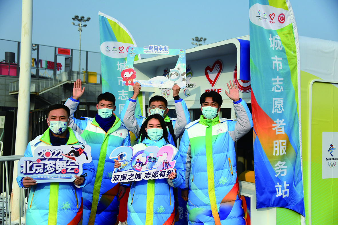 ▲1月25日,北京2022年冬奥会和冬残奥会海淀区城市志愿者代表在五棵松体育中心附近的城市志愿者服务站合影。 新华社记者/任超 摄