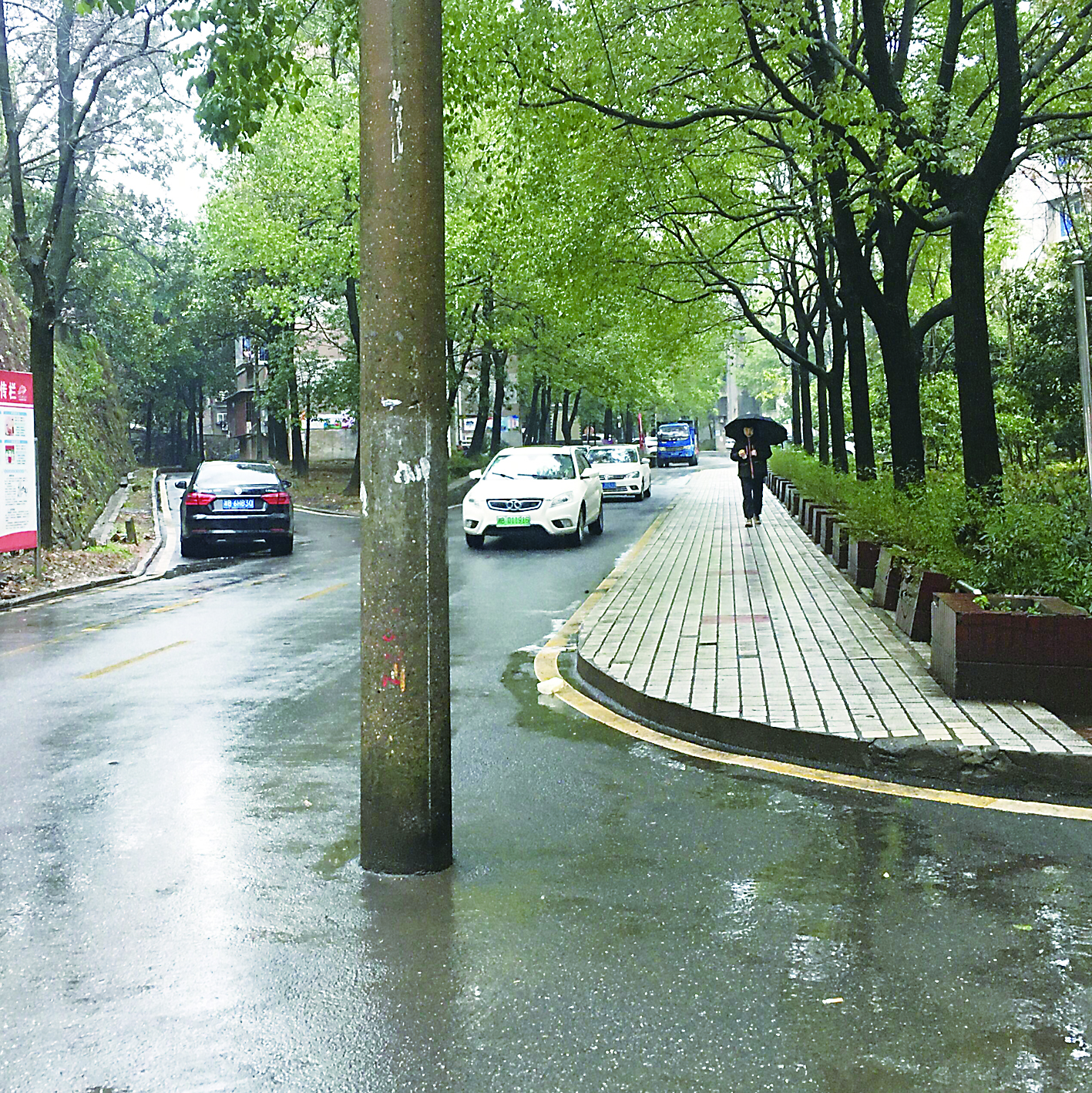 占道的电线杆位于一处三岔路口,距离最近的人行道超过1米远。电线杆上无警示标识、防撞设施,不时有车辆、行人从电线杆旁经过。