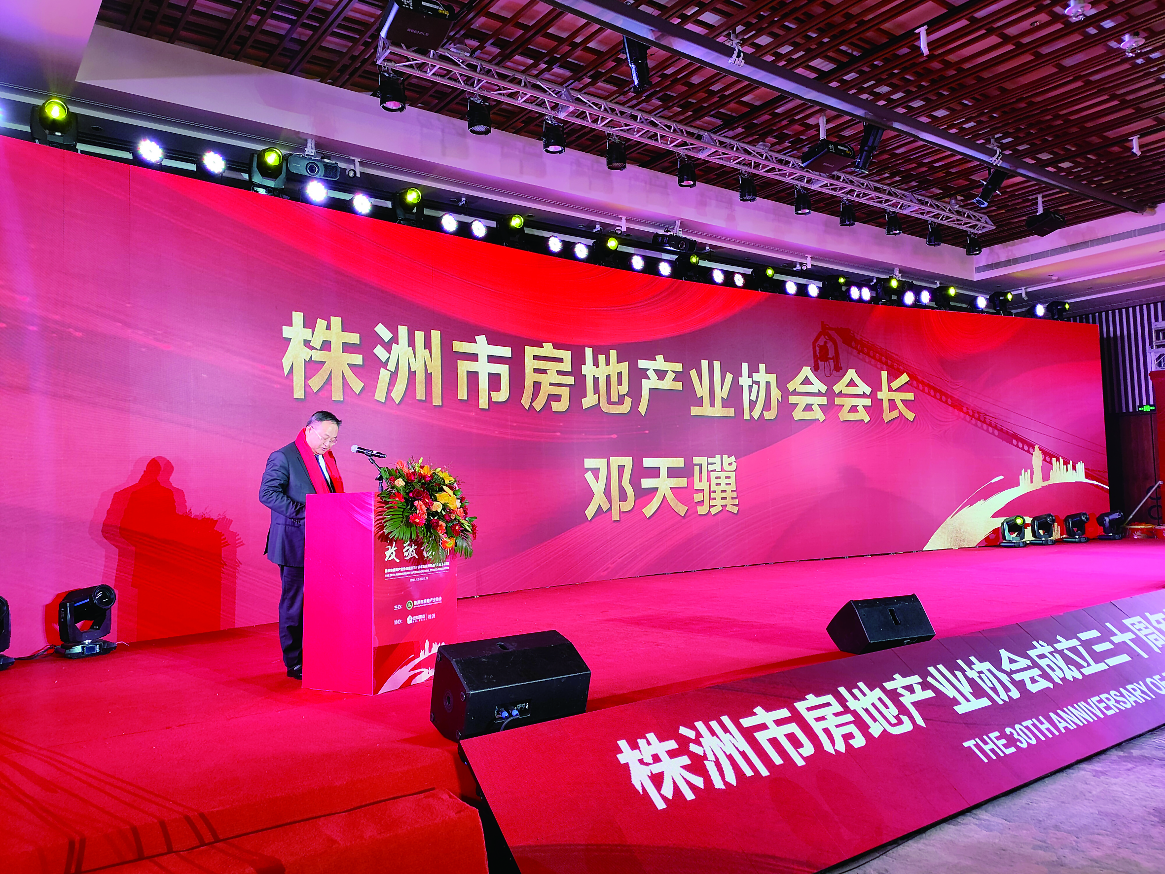 株洲市房地产协会会长邓天骥在致辞中说到,“过去的30年,我们在摸索中发展;未来,我们也将在探索中继续砥砺前行!面临百年一遇之大变局,我们知道,我们的担子和责任有多重。我们更相信,在政府的大力支持下,在所有同仁的共同努力下,我们终将创新突围,风雨过后见彩虹,未来的30年更精彩!过去,我们只争朝夕!未来,我们不负韶华!一代人,一座城!”他慷慨激昂地表示,每一位做出实实在在贡献的地产人都是真英雄,大家应当共襄株洲市房地产行业的发展与成果,并总结了过往30年的工作成绩与成功经验,感谢了所有株洲本土房企和外来品牌房企为城市建设的进步、经济发展、产业配套、人居质量的提高所作出的卓越贡献。