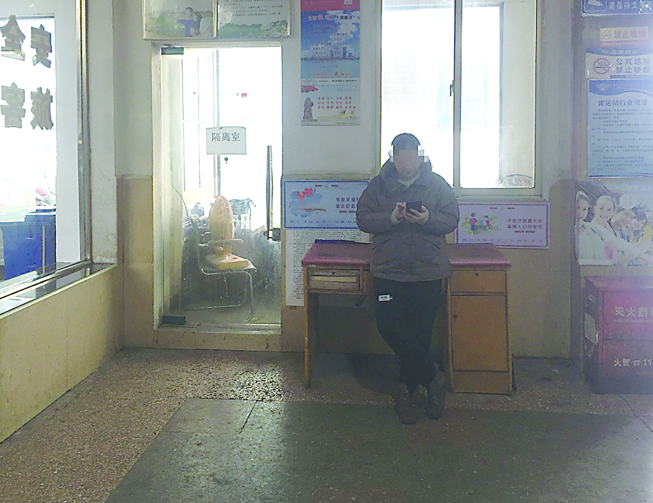 ▲湘运长途汽车站隔离室前,一名工作人员未戴口罩在看手机。 记者/刘平 摄