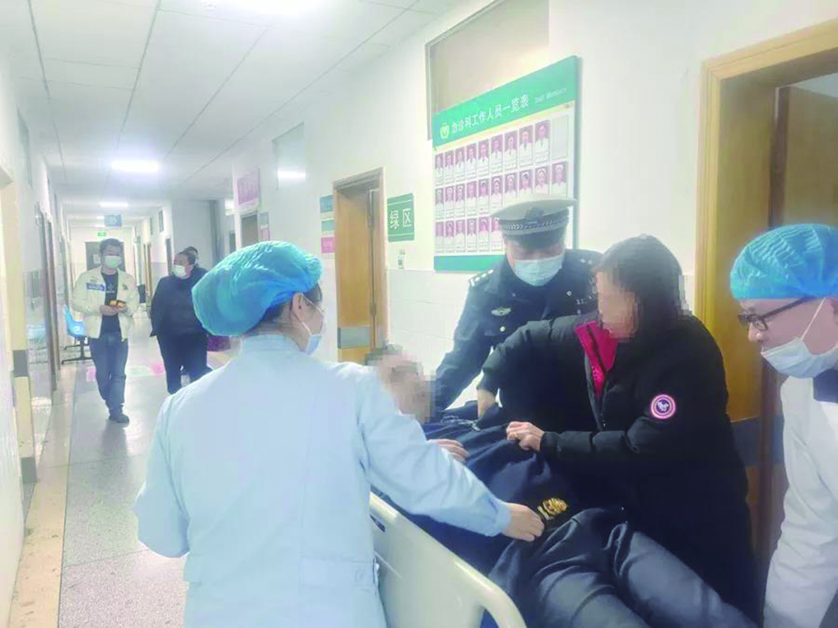 ▲高速交警将突发疾病的吴某送往医院救治。通讯员供图