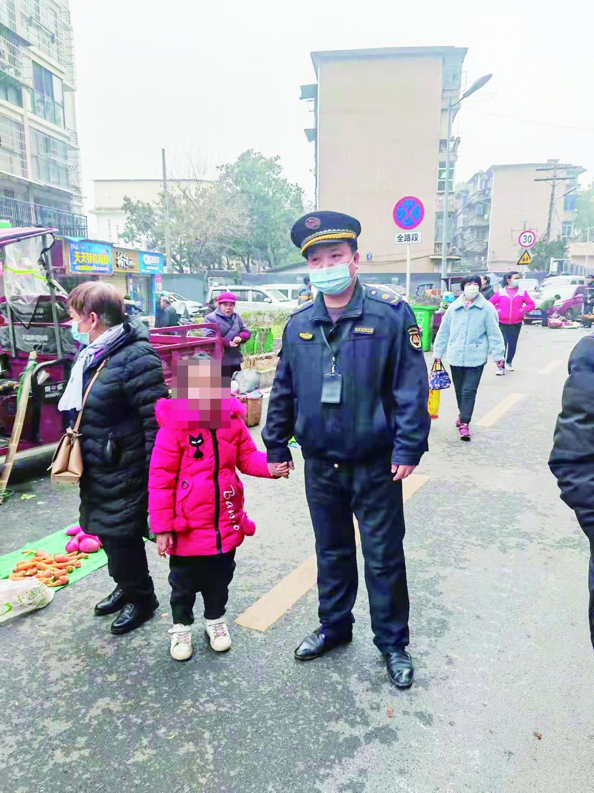 ▲石峰区城管队员帮助小女孩找回家人。通讯员供图