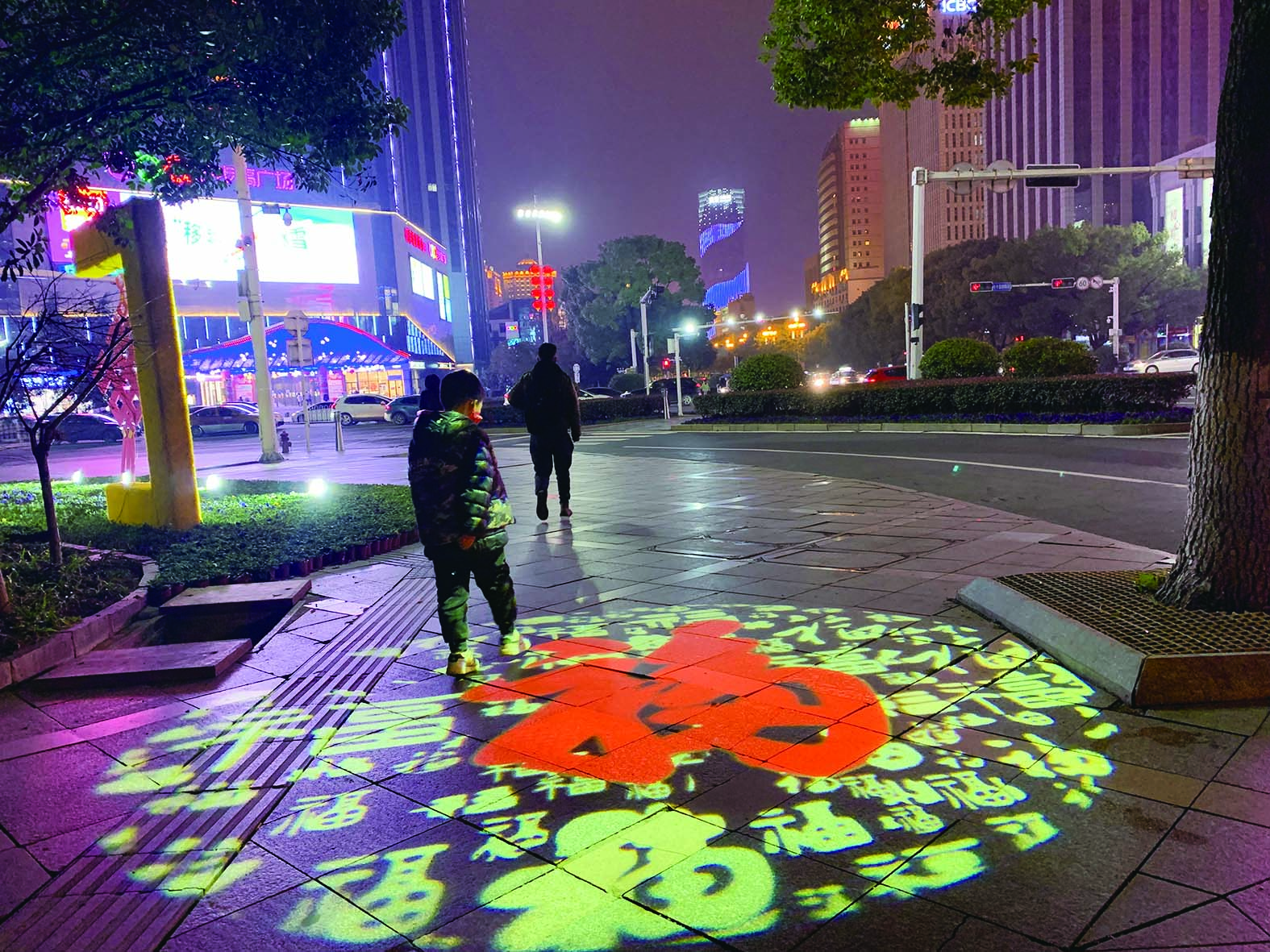 1月30日晚,在天台路人行道上,造型别致、颜色亮丽的“福”字已铺上了路面,相隔数米一直向东延伸,各式投影灯将路边的行道树映衬得五彩斑斓,更加衬托了春节的喜庆氛围。俯瞰这条街,宛若一条美丽的彩带延伸通向远方,新年气息扑面而来,引得不少群众驻足观赏。
