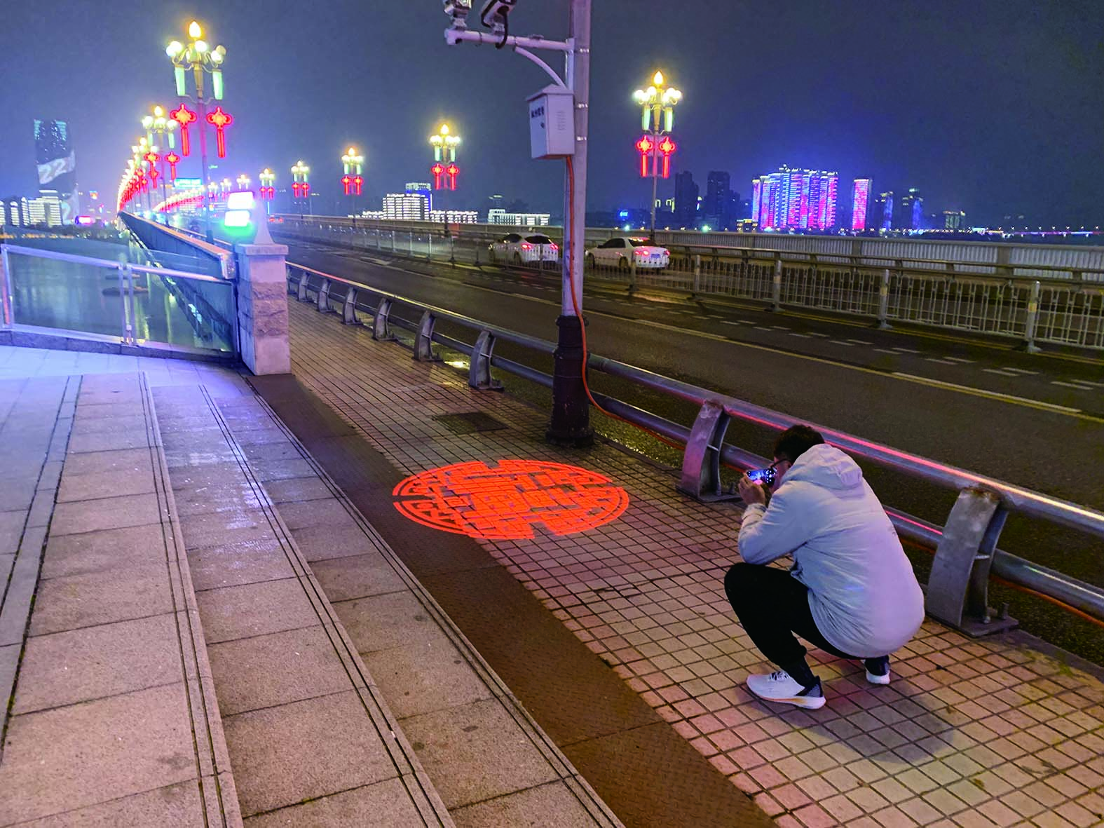“每盏投影灯的图案都有精心搭配过,不止一个模板。”市城管局灯饰管理处相关负责人介绍,天台路至中心广场沿线,共安装200套投影灯,其“福”字的投射直径为1.8至2.5米不等,通过有序交叉排列,最终组合成一条祥和、温馨的新年“福”街,连接湘江两岸。