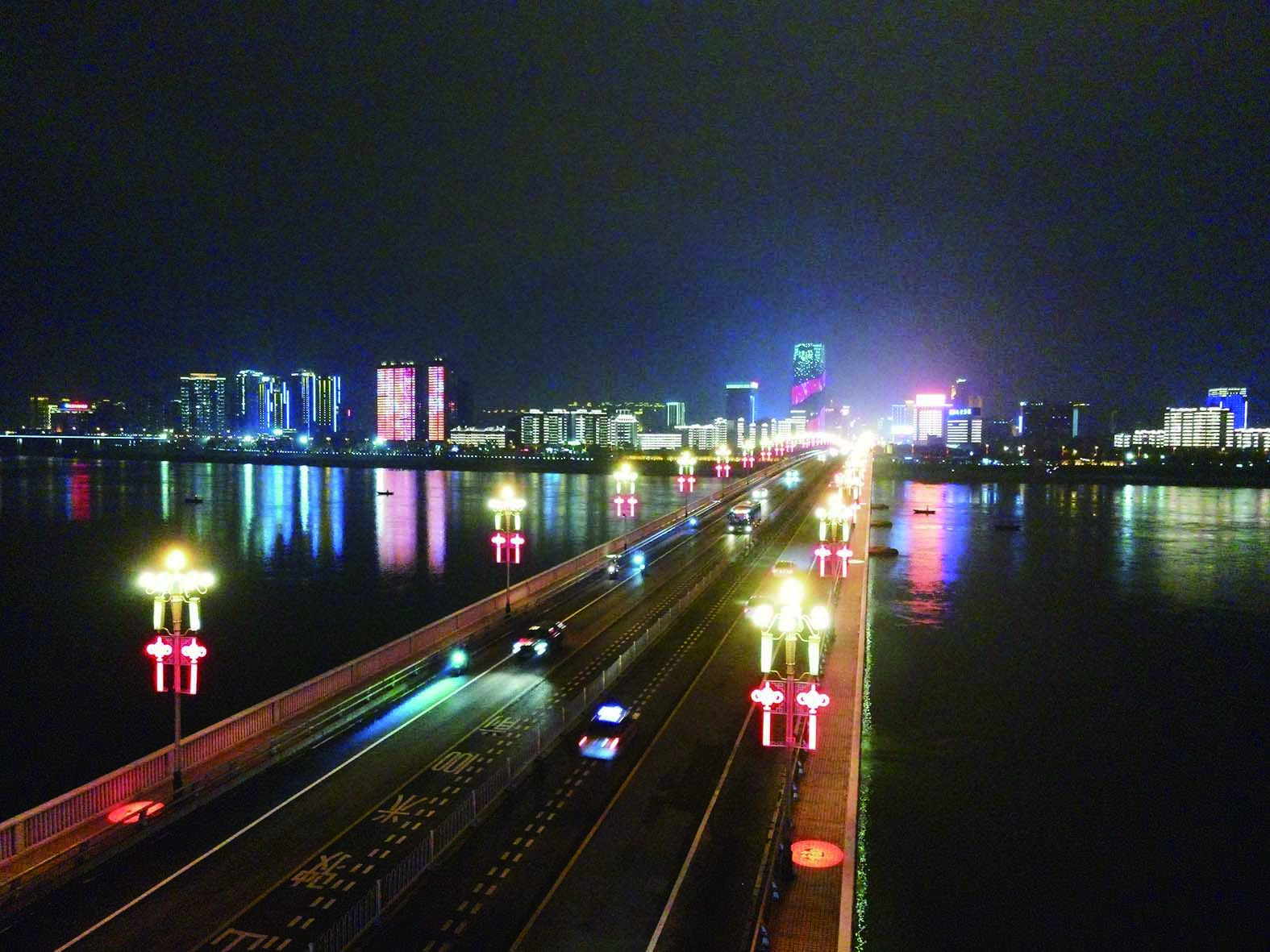 ▲株洲大桥上每个福字有序交叉排列,组成一条祥和、温馨的新年“福”街。