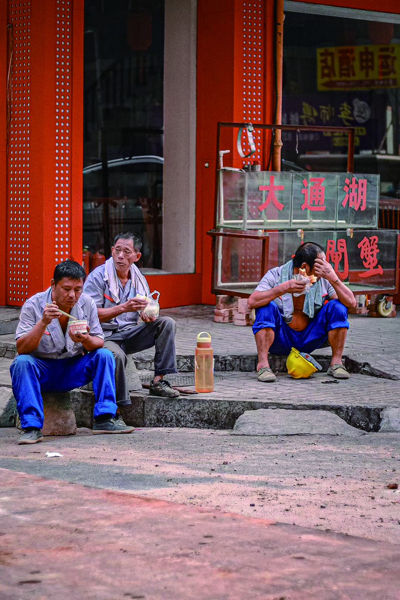▲工人们做完事在路边休息