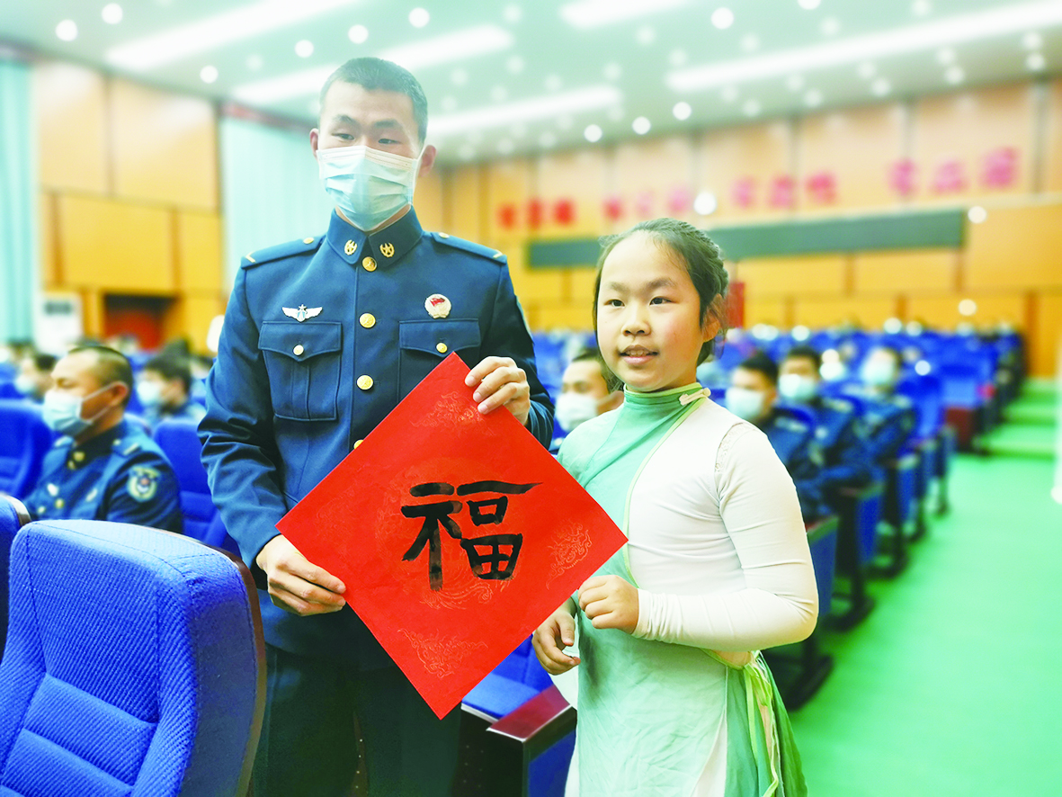 虽然寒意料峭,却丝毫影响不了孩子们送祝福、表关心的热情。孩子们为军人叔叔精心准备了悠扬的古筝演奏和歌曲合唱、精彩的武术表演和诗歌朗诵……小小书法团写“福”送祝福的环节更是把活动推向了高潮。