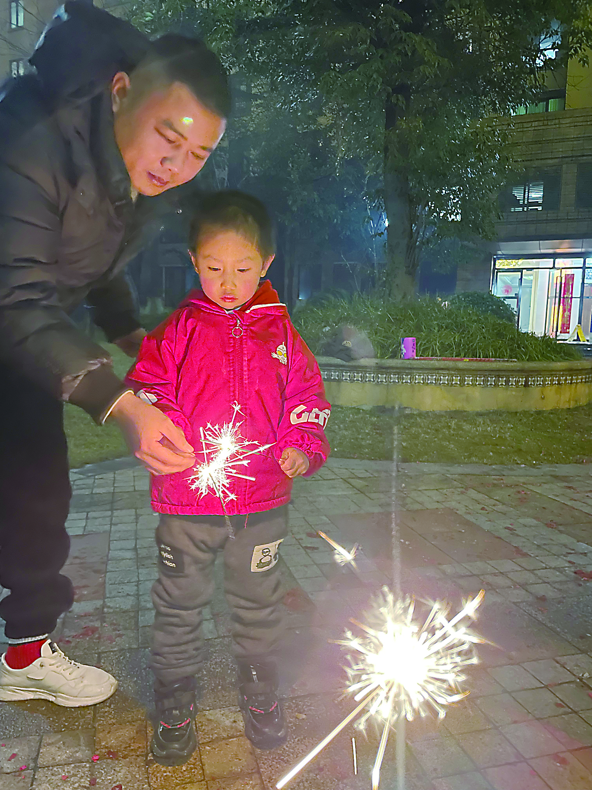 ▲市民带着孩子在楼下玩烟花。 株洲晚报融媒体记者/张媛 摄