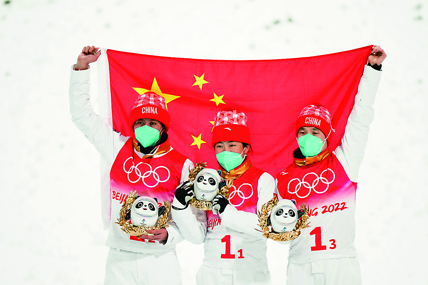 2月10日,亚军中国队选手贾宗洋、徐梦桃和齐广璞(从左至右)在颁发纪念品仪式上。 当日,北京2022年冬奥会自由式滑雪空中技巧混合团体决赛在张家口赛区举行,中国队收获银牌。