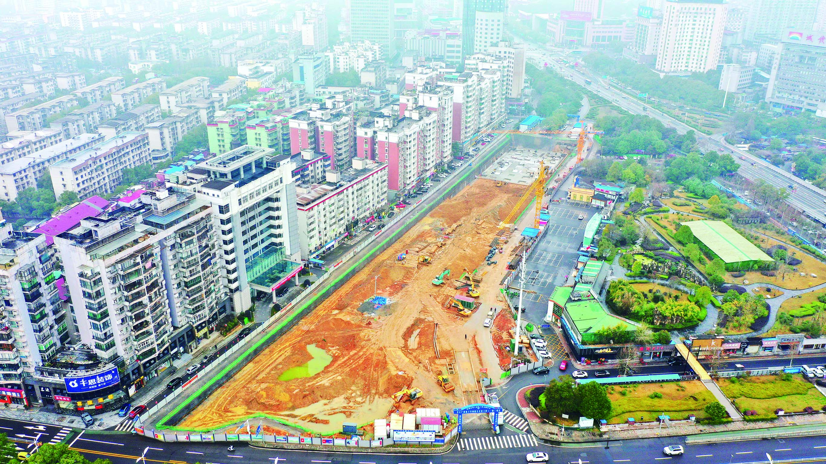 春节刚过,长江广场地下空间综合开发工程建设现场就呈现出一派热火朝天干劲十足的景象。据悉,该项目于正月初六复工,高峰期的作业人数多达300人。目前,长江广场地下空间综合开发工程一工区已经完成土方开挖工程,现在正在做防水工程和承台底板钢筋绑扎,其他工区也将按计划进入施工阶段。预计4月初完成主体施工。图为2月11日航拍画面。 (株洲晚报融媒体记者/谢慧 摄影报道)