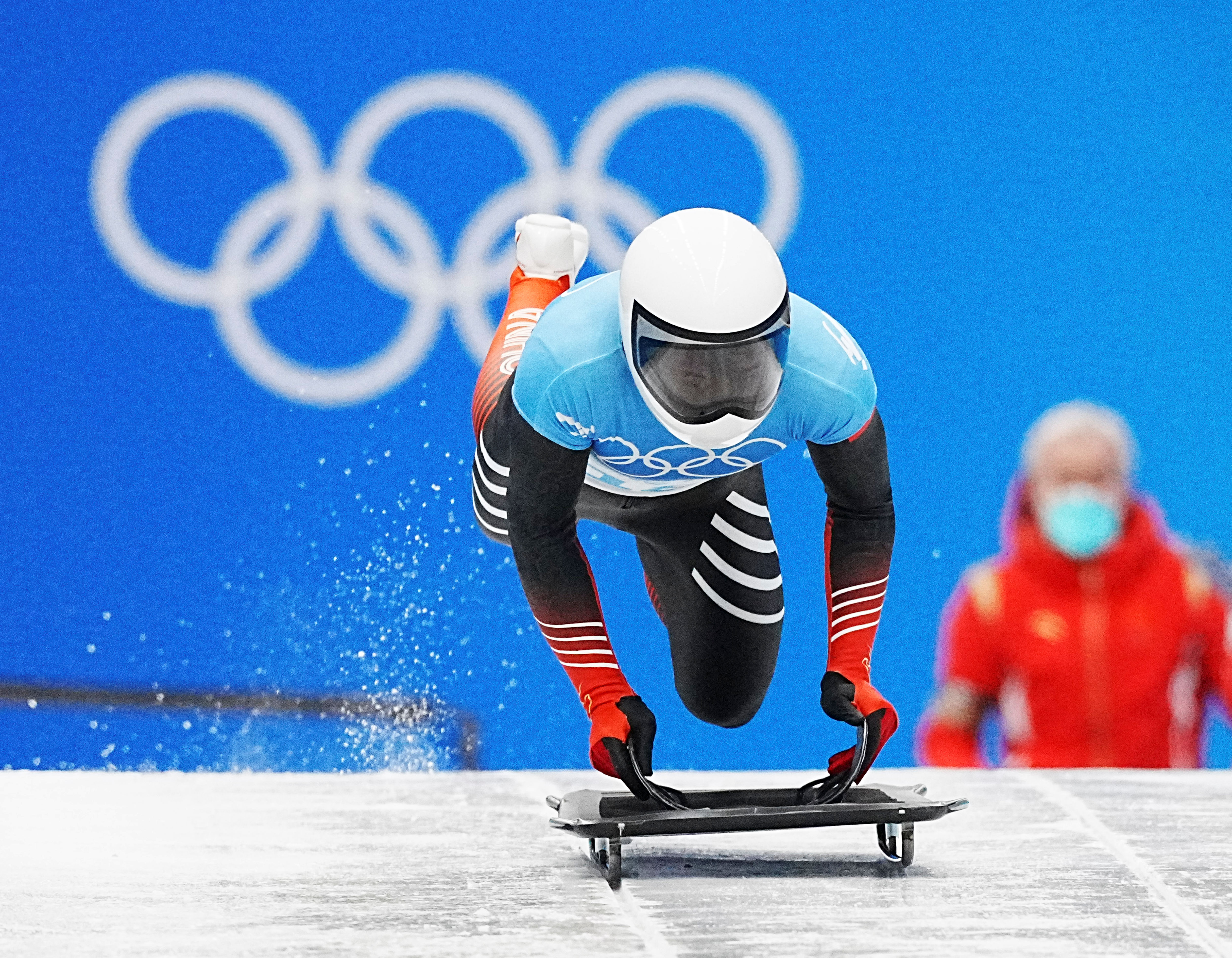 此前,中国男子钢架雪车冬奥会的最好成绩是耿文强在平昌冬奥会上创造的第13名。本届冬奥会,闫文港首次站上奥运舞台便摘得铜牌,为中国创造了历史。另一名中国选手殷正位列第5。图为闫文港在比赛中。