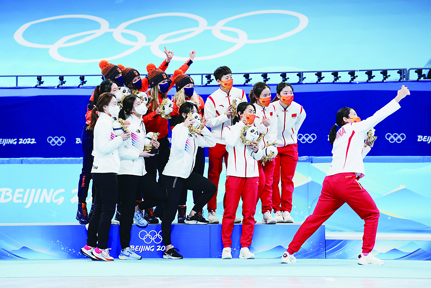 ▲2月13日,冠军荷兰队选手、亚军韩国队选手与季军中国队选手在颁发纪念品仪式上合影。新华社记者/熊琦 摄
