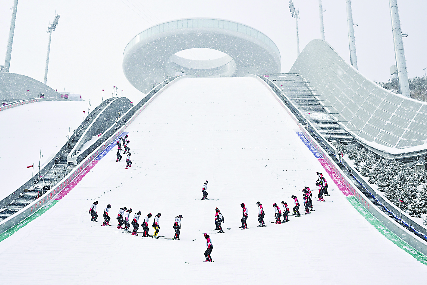 ▲2月13日,张家口赛区迎来降雪天气,国家跳台滑雪中心赛场内,工作人员在整理赛道。 新华社记者/姜克红 摄