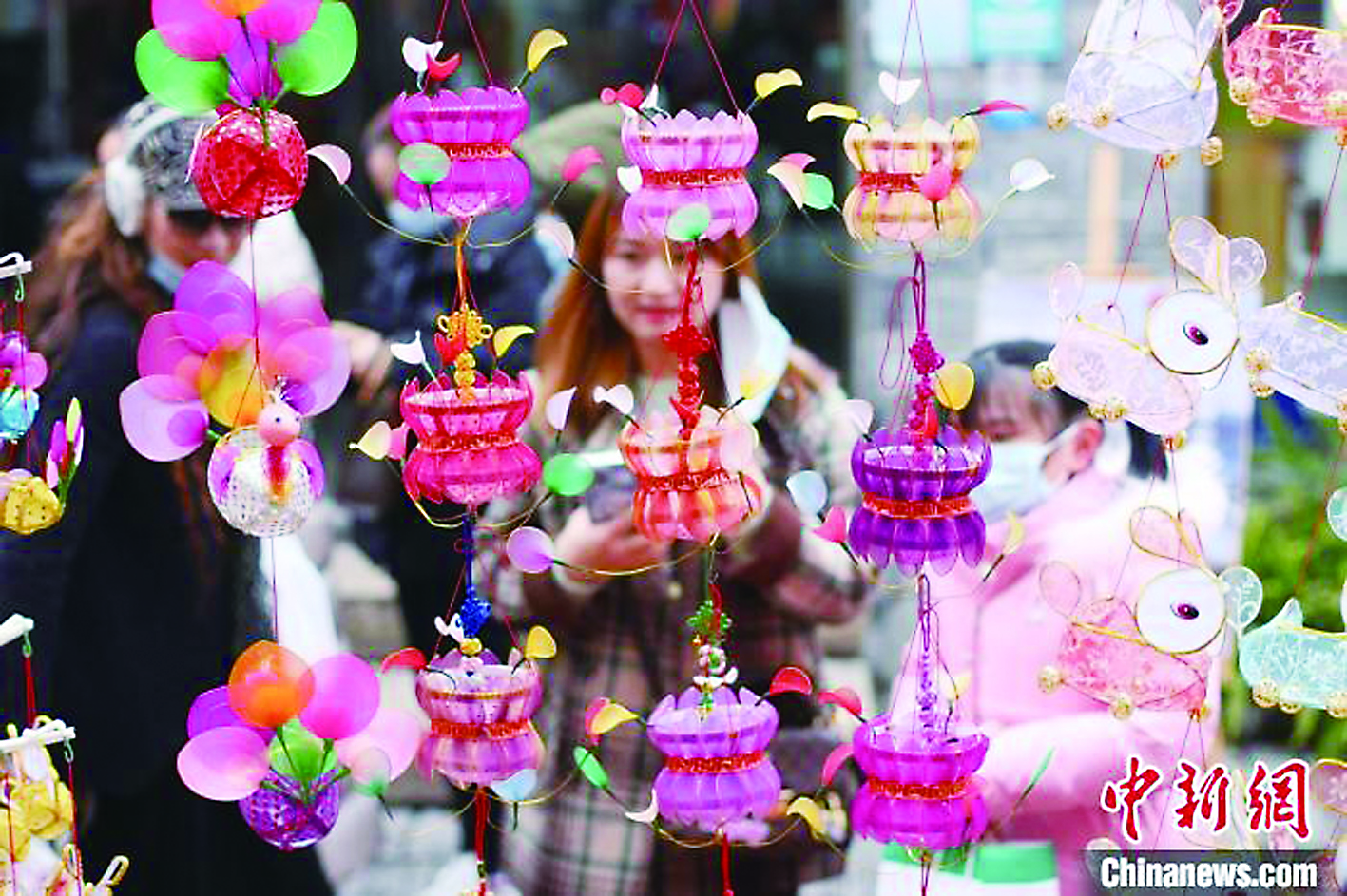 2月12日,江苏南京,市民在熙南里街区笪桥灯市上选购花灯。随着农历正月十五元宵节的临近,南京传统手扎秦淮花灯走俏。