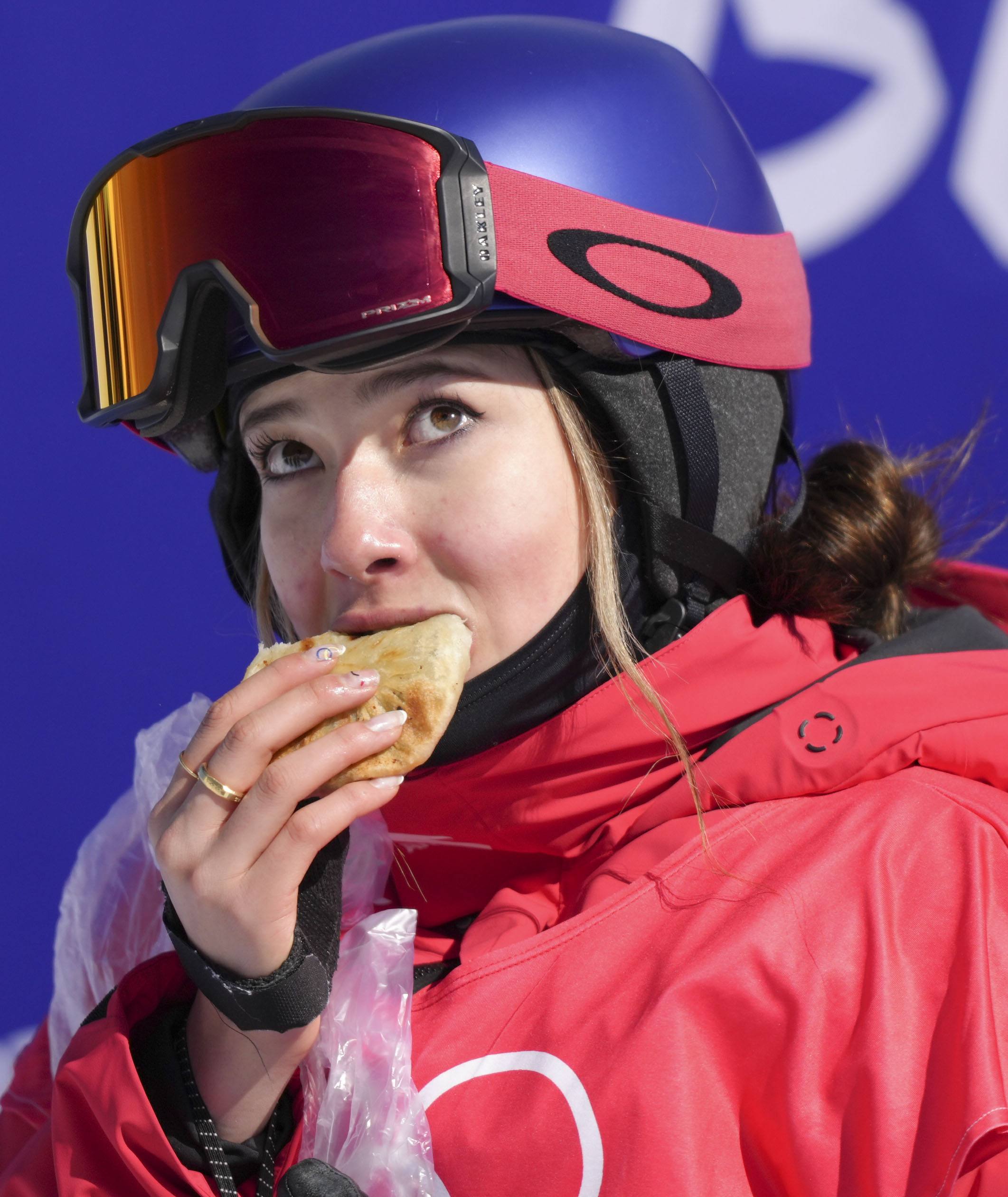 ▲2月14日,中国选手谷爱凌在比赛后等待成绩时吃韭菜盒子。 新华社记者/薛玉斌 摄