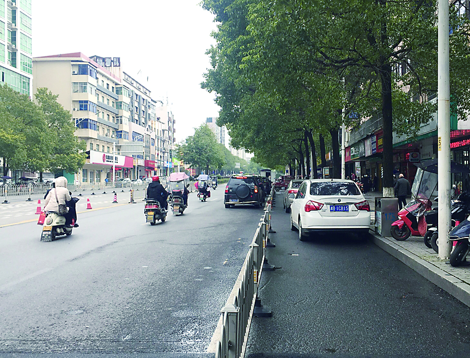 2月15日,记者对向阳广场至北环线之间的新华东路沿线进行走访,发现路边未施划停车位,仅在桂花派出所前的非机动车道上施划了4个停车位,上面写有“警车”字样。其中新华东路戴家岭农贸市场附近路段,中间是智轨车道,行车道与非机动车道之间安装了隔离栏,要求非机动车和机动车按规定车道通行。